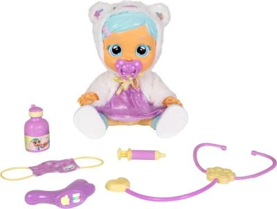Das IMC Toys Spielset Cry Babies Dressy Kristal wird gesund kommt mit tollem Zubehör und sorgt für ganz viel Pflegespaß! Das süße Cry Baby Kristal kränkelt. Vor allem jetzt braucht sie besonders viel Liebe und Fürsorge. Ist ihr Schnuller weg, beginnt sie zu jammern, gibt schluchzende Laute von sich und weint große Kullertränen – fast wie ein echtes Baby. Um wieder gesund zu werden, braucht sie schnell die richtige Medizin und ausgiebige Kuscheleinheiten. Gibt man ihr den Schnuller, hört sie auf zu weinen. Wenn Kristal fröstelt und niest, findet man mit dem Thermometer schnell heraus, ob sie Fieber hat. Ihr starker Husten wird am besten mit Hustensaft behandelt. Das Stethoskop überprüft den Herzschlag und zur Sicherheit sollte Kristal, solange sie krank ist, eine Mund-Nasen-Maske tragen. Oh nein, wo kommen nur die roten Punkte in Kristals Gesicht her? Jetzt heißt es Spritze geben. Super gemacht! Diese süße Cry Babies Puppe trägt putzige, ausziehbare Kleidung mit Schuhen. Mit insgesamt 11 Sounds und den verschiedenen Krankheitssymptomen, bleibt es mit Kristal immer spannend.