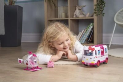 Tatü, Tata, HELLO KITTY ist da! In dem supersüßen Spieleset ist alles enthalten, was angehende Ärztinnen so brauchen. Der Ambulanz-Wagen lässt sich im Handumdrehen in eine Notaufnahme umwandeln und ist mit Krankenbett, Herzfrequenz-Messgerät und Tropf ausgestattet. Natürlich dürfen auch Arztequipment wie Spritze und Stethoskop nicht fehlen. Für spektakuläre Einsätze aus der Luft gibt es außerdem einen tollen Helikopter mit aufklappbarer Frontscheibe dazu, auf dessen Sitz HELLO KITTY sogar Platz nehmen kann. Damit die Patienten auch dort ideal transportiert werden können, gibt es eine Transport-Bahre zum Einhaken. Der kleine Teddybär freut sich sicherlich darüber, endlich verarztet zu werden. Und damit er auch schnell gesund wird, gibt es noch einen Rezeptblock für Medikamente dazu. Mit den fünf verschiedenen HELLO KITTY-Figuren ist auf jeden Fall für viel Abwechslung beim Spielen gesorgt!