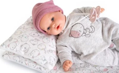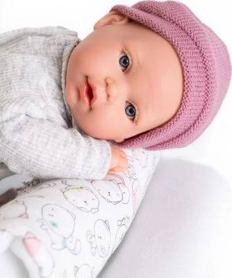 Die Babypuppe Kika von JUAN ANTONIO munecas liebt es, mit Kätzchen zu spielen. Deshalb möchte sie, dass all ihre Accessoires auch Kätzchen haben. Auf dem Pyjama, der Matratze und dem Kissen sind niedliche Katzenprints. Kika ist eine Puppe mit Geräuschmechanismus: Wird der Schnuller entfernt, weint sie und ruft nach ihren Eltern. Aber wenn ihr der Schnuller zurückgegeben wird, beruhigt sie sich. Der Körper der Puppe besteht aus weichem Stoff und ihre Gliedmaßen sind aus weichem Vinyl. Sie misst 27 cm und wiegt 290 g.