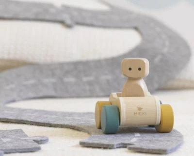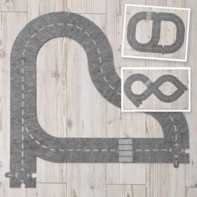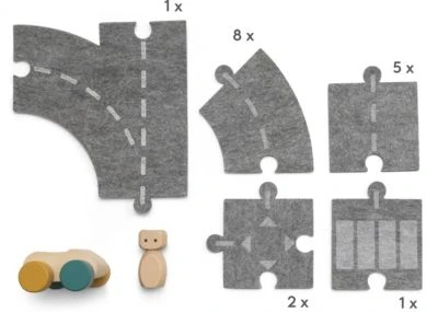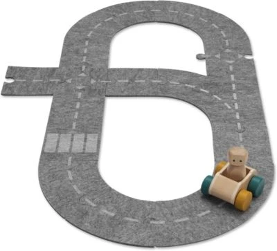 Mit diesem Spielset verwandeln Kids ihr Kinderzimmer in ein Paradies für Autos. Die Zusammenstellung von Micki verfügt insgesamt siebzehn Teile,die sich ganz nach Belieben zu verschiedenen Straßenkonstellationen zusammensetzen lassen. Das weiche Filzmaterial ist dabei strapazierfähig und schont den Boden. Mit dem im set enthaltenen Auto aus Holz inklusive Figur kann die neue Strecke sogleich ausprobiert werden.